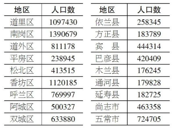 注:國(guó)家按行政區(qū)劃反饋我市各區(qū)縣(市)人口數(shù)據(jù),利民開(kāi)發(fā)區(qū)人口數(shù)據(jù)目前包含在呼蘭區(qū)中。