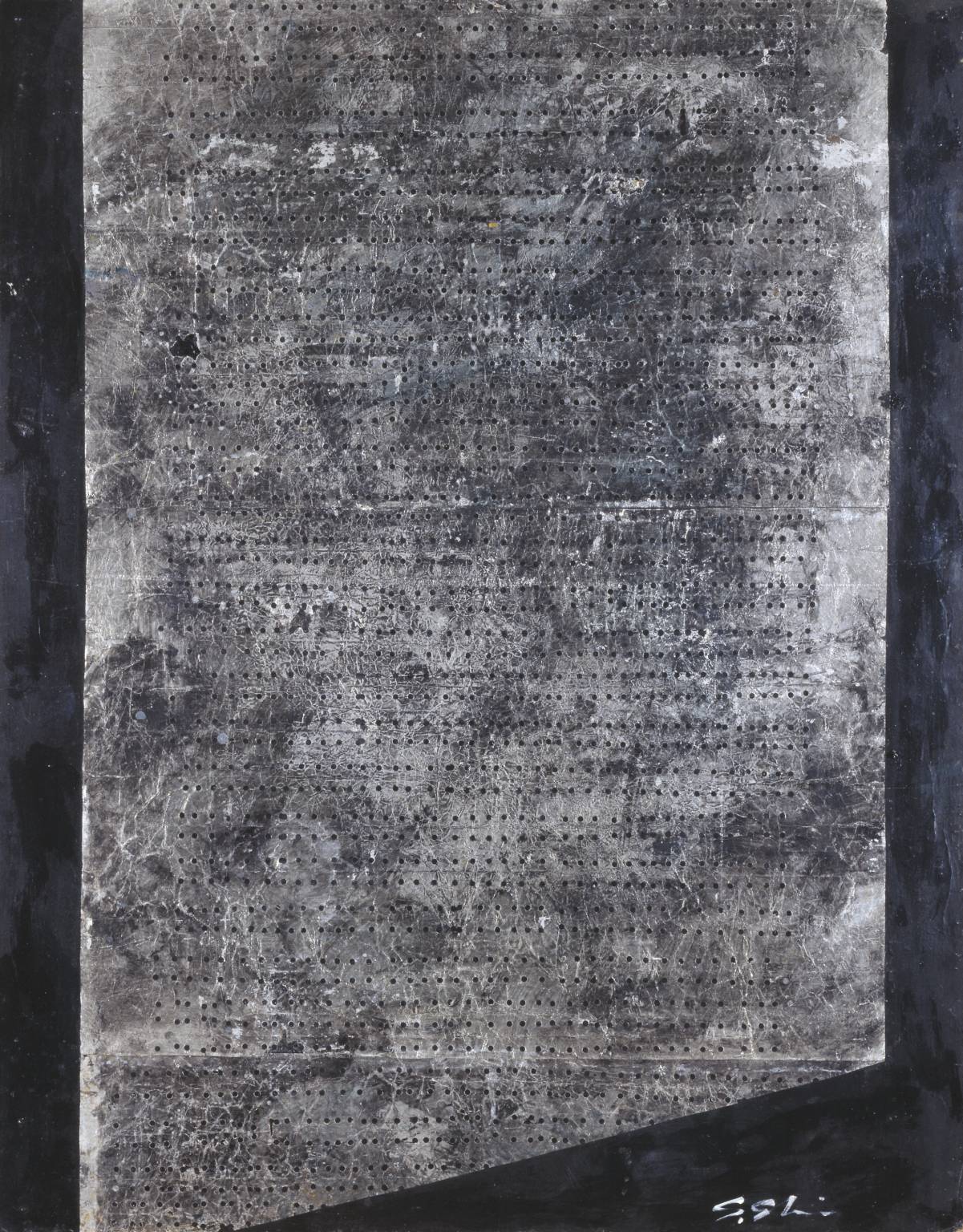 In a letter of 16 July 2002 to Tate, Shozo Shimamoto explained that he devised Holes, 1953, when he got hold of some silver paper and started ‘playing around with a hole punch’ in his studio in Nishinomiya City, Japan. At that time the artist was making other works with the same title (see, for instance, Holes, 1954, Tate T07897). To make this work, foil sweet wrappers were perforated with a hole punch and pasted on a sheet of plywood painted black; a wash of black ink was then thinly wiped over the surface.