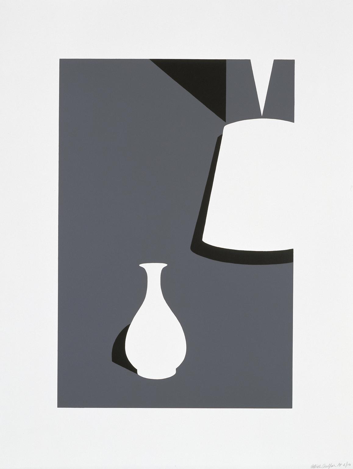 White Ware Prints is a portfolio of eight screenprints made at Advanced Graphics, a fine art print workshop in London. It was published in an edition of forty-five with thirteen proofs of each image by Waddington Graphics, London; Tate’s set is the sixth of the artist’s proofs. Each print is signed by the artist and inscribed ‘AP’ below the lower right corner of the background set in a broad white margin. The initials ‘WG’ are embossed into the corner of each print. In the White Ware series, the predominant colour scheme is black and white. The subject of each print is a single white ceramic pot represented against a dark background. Caulfield told Alan Cristea, his print dealer, that the inspiration for this series came from the Victoria & Albert Museum in London, and specifically from the catalogues they published of their collections of oriental ceramics (email to the author 16 March 2009). The term white ware simply refers to any pottery that has a white glaze. The colour of the ground varies from print to print, from dark blue to grey to brown to black. Three of the prints have accents of other, brighter colours, possibly suggestive of light falling through coloured glass. All of the prints have shafts of strong white light as part of their composition, while some include a light source such as a lampshade or window. As with many of Caulfield’s images, such as Wall Plates (1997, P79185 - P79188 ), the light source appears to come predominantly from the top right, although the artist’s intention was not to imitate the effects of light in a realistic fashion. Lamp and Lung Ch’uan Ware depicts an elegant white bottle or vase in the foreground against a dark grey background, with part of a white lampshade behind it to the right hand side. A triangular shaft of light emerges from the top of the lampshade, and sharp black shadows outline part of the vase and shade. The composition of this print is closely related to that of another one in the same portfolio, Lamp and Kuan Ware ( P79195 ). The Lung Ch’uan potters of Southern China during the Sung Dynasty (960–1279 AD) were famous for the elegant shapes and beautiful pale green glazes of their ceramics. In many ways, Caulfield’s increasing preoccupation with the representation of light and shadow became in itself the subject matter of his work, and this is particularly true of White Ware Prints . Speaking to Marco Livingstone in the early 1980s he explained: ‘Once I got on to shadows, I really went to town; they became compositional elements, in fact more than the objects that the shadows came from. They’re all silhouettes. You accept them as shadows, but they’re not at all as shadows would be.’ (Quoted in Livingstone, p.86, note 50.) He continued: ‘I’m not actually painting from observation of light, I’m making up an idea of how light could appear to be. The angles of light in naturalistic terms could be totally wrong, but they either help the composition of the picture or they help the feeling of light more strongly.’ (Quoted in Livingstone, p.95.) Writing about the depiction of light in the White Ware Prints , Mel Gooding described how light: is reduced to the most beautifully precise sign in images of startling abstract refinement. Caulfield’s abiding preoccupation with light is a component of his deepest philosophical and thematic concerns. For light is the very element of the visual, it is the determinant of colour, it discloses space. To consider visual representation and its paradoxes is to contemplate before anything else the phenomenon of light. (Gooding, p.15.) Patrick Caulfield made his first print, Ruins ( P04076 ), in 1964 at Kelpra Studio, the fine art print workshop established by master printer Chris Prater in the late 1950s. Having chosen the medium of screenprinting for its ability to create immaculately flat areas of bright, saturated colour, Caulfield continued to collaborate with Prater and, from the late 1960s, with Chris Betambeau and later Bob Saich at Advanced Graphics. He produced prints regularly throughout his career, until 1999 when he made Les Demoiselles d’Avignon vues de Derrière ( P78309 ), an homage to Pablo Picasso’s great painting Les Demoiselles d’Avignon 1907 (Museum of Modern Art, New York). For Caulfield, printmaking was a parallel activity to his painting, allowing him to explore the same subject matter and artistic concerns, as he explained: Because I’m such a slow producer of paintings, I regard printmaking as a way of extending the kind of imagery that concerns me, because of its multiplication in editions. I don’t think of a print as very different to a painting, because I make a painting for each print in more or less detail. I’m not really a printmaker at all. I provide an image and then it’s printed by professional printers. It’s a relief to see this work under way. (Quoted in Livingstone, p.31.)
