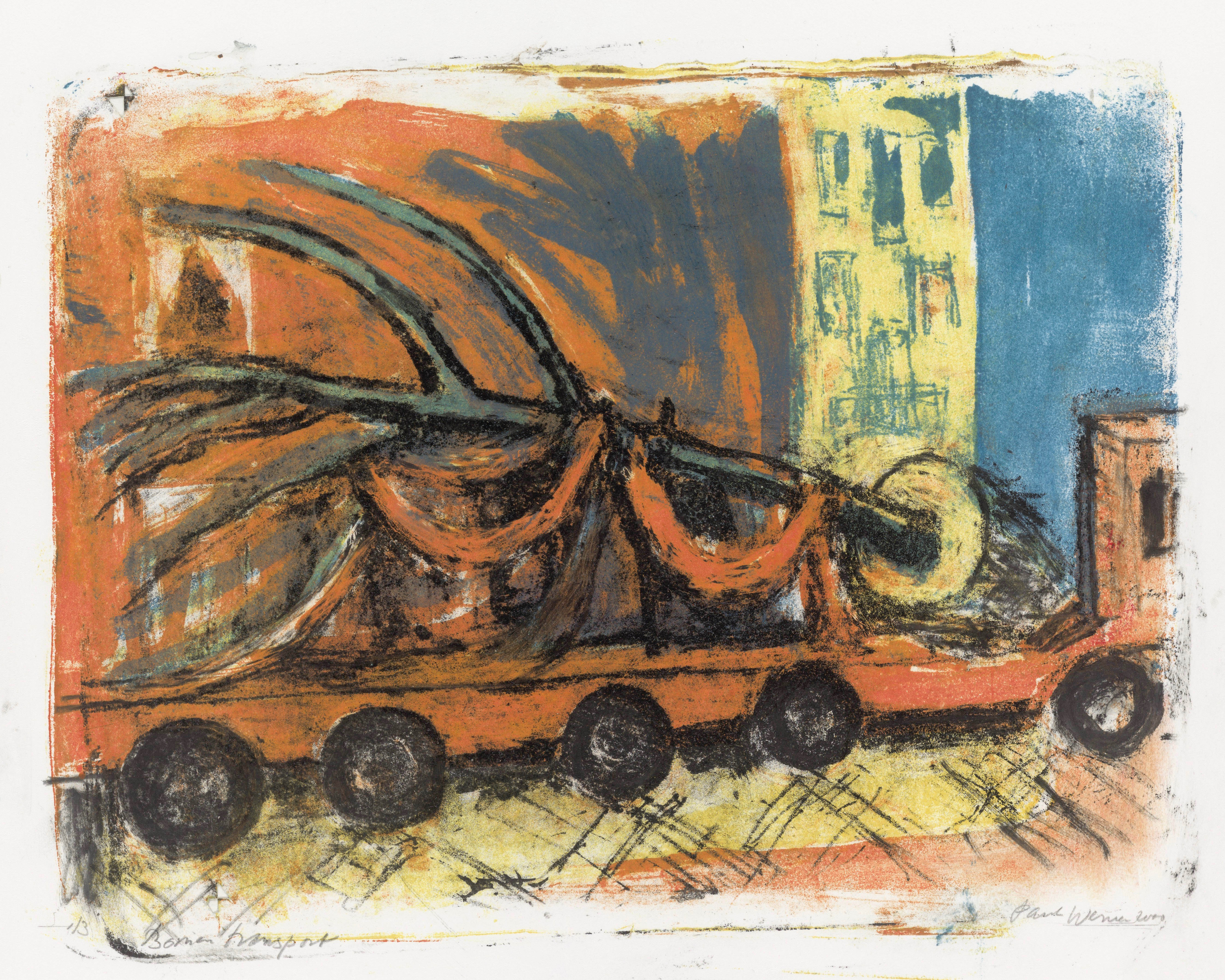 In the neighborhood of the artist one day in 2000 a large tree was transported by car. Paul Werner loves trees very much. This transport was in his own street where he live, in Amsterdam city.. He made a gouache painting after a fast sketch and later this color-lithography in a very small edition of 3 prints.Owner of this color-lithography print 1/3 - is the Amsterdam City Archives - Beeldbank Amsterdam
