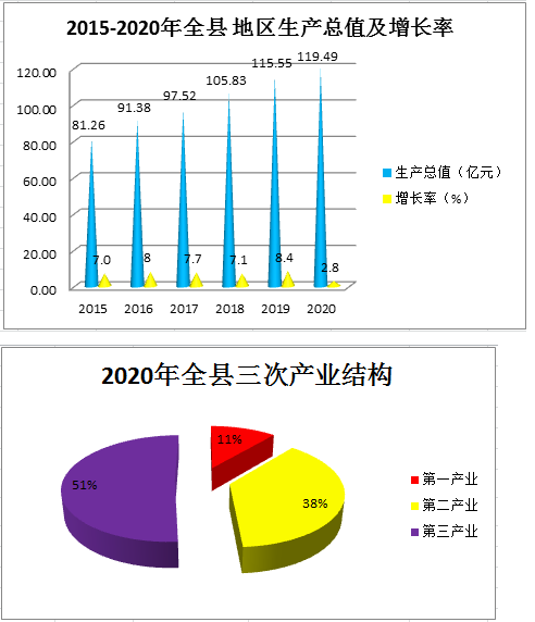 根據(jù)地區(qū)生產(chǎn)總值統(tǒng)一核算結(jié)果:2020年,全縣地區(qū)生產(chǎn)總值(GDP)119.49億元,同比增長(zhǎng)(可比價(jià)、下同)2.8%。分產(chǎn)業(yè)看,第一產(chǎn)業(yè)增加值13.40億元,增長(zhǎng)2.3%;第二產(chǎn)業(yè)增加值45.17億元,下降0.3%,其中工業(yè)增加值36.51億元,增長(zhǎng)0.8%;第三產(chǎn)業(yè)增加值60.92億元,增長(zhǎng)5.7%。三次產(chǎn)業(yè)比重為11.2:37.8:51.0,與2019年的11.3:40.1:48.6相比,呈“一升兩降”態(tài)勢(shì)。