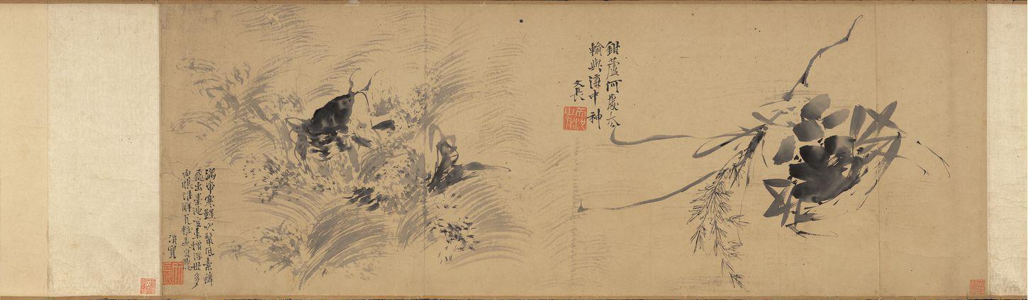 紙本,墨筆,28.7x98cm,北京故宮博物院藏。圖右側(cè)繪蟹一只,左側(cè)似有蝦二只,其中一只蝦其頭巨大無比。畫家以潑墨的方式描畫出蟹和蝦的輪廓,再以濃墨突出蟹、蝦的霸氣,水波更有大氣磅礴之勢。 徐渭,字文清,后改字文長,又稱徐文長,明代文學(xué)家、書畫家和軍事家,其人生經(jīng)歷坎坷。
