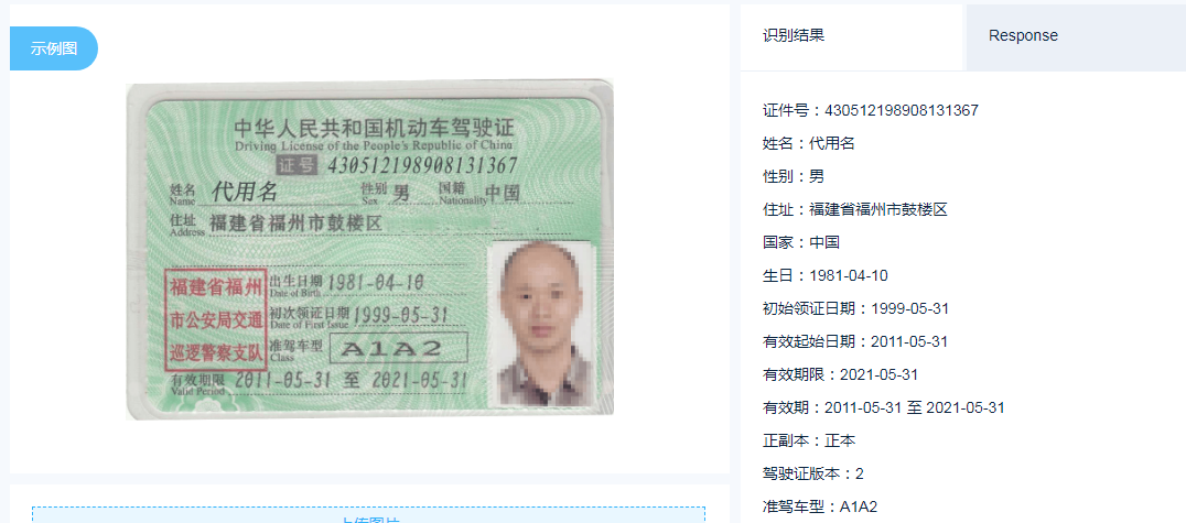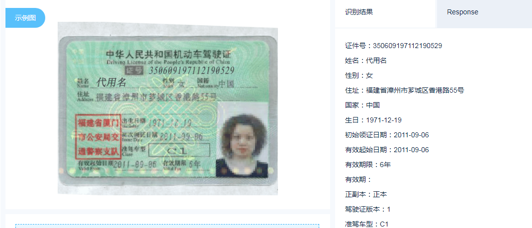 【AI技術(shù)】支持對機動車駕駛證正頁的關(guān)鍵字段識別,包括證號、姓名、性別、國籍、住址、出生日期、初次領(lǐng)證日期、準(zhǔn)駕車型、有效期限。